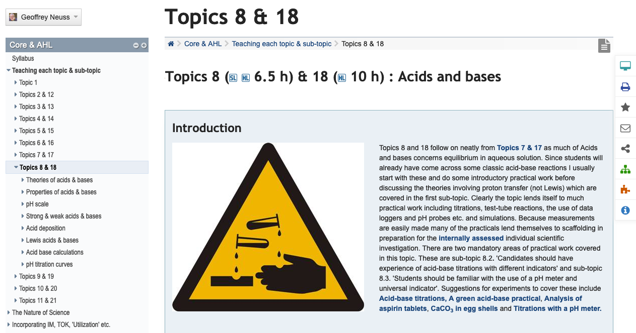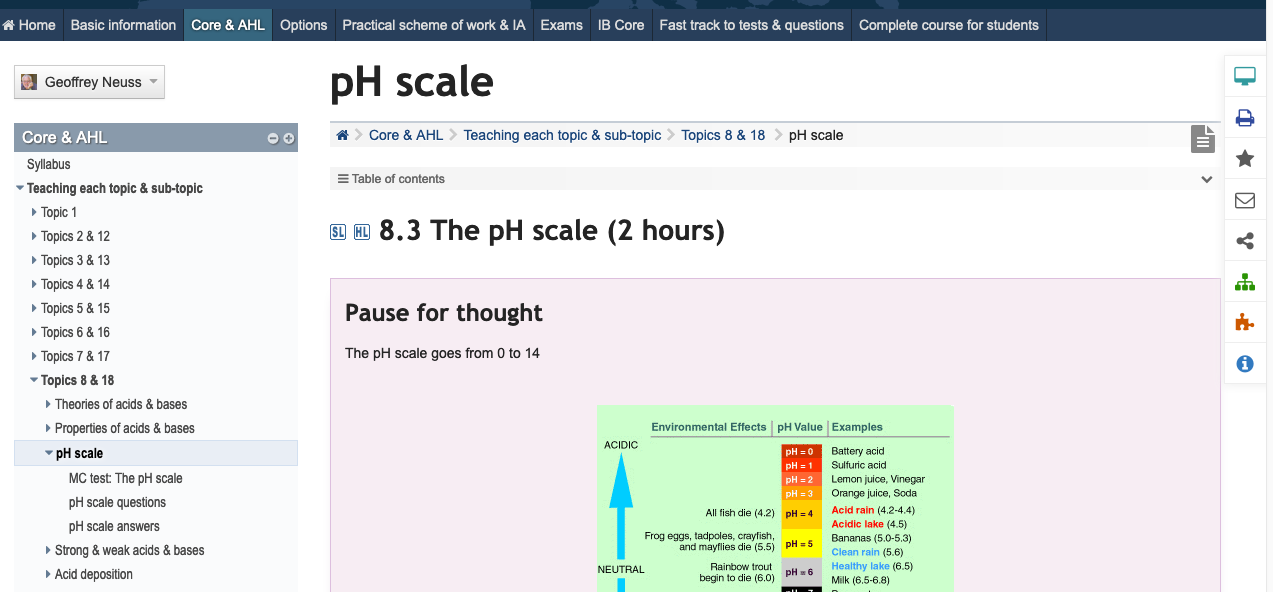 This particular page contains an introduction to Core Topic 8 and AHL Topic 18: Acids and bases. On the left you can see a breakdown of all the sub-headings under Core & AHL and the headings under the chosen sub-heading Teaching each topic and sub-topic. You can see in bold the page that is open and the children pages attached to it. These eight children pages are the separate sub-topics under Topics 8 and 18. Clicking on any one of them will open the page, e.g. pH scale.