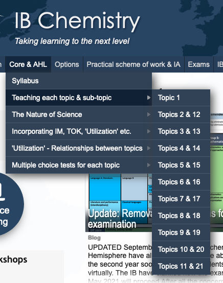 Putting your cursor on one of them will bring a drop down menu. For example under Core & AHL you will find it contains six sub-headings. If you put the cursor on any one of these that has a right arrow (indicating that it has children) it will open up to show you the all the headings underneath, e.g. Teaching each topic & sub-topic will bring up the sub-headings associated with this topic.