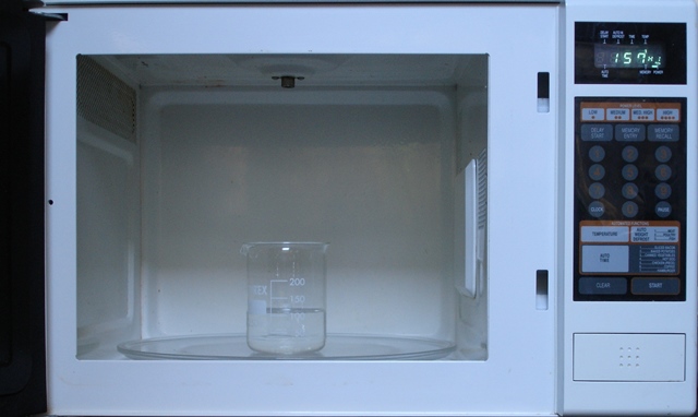 Water is a polar molecule as it has a bent shape and polar O-H bonds. These are given energy by the oscillating microwaves as they continually try to line up with the field and so heat up. Tetrachloromethane is made up of non-polar molecule as the resultant polarity of the four symmetrical C-Cl bonds is zero. The molecules are thus unaffected by the microwave radiation.