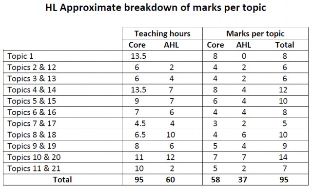 - The amount of marks for each topic will approximately be related to the number of recommended teaching hours for each topic.