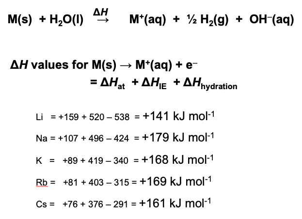 Why is the reaction of alkali metals with water so exothermic when the process of M(s) → M+(aq) + e− is endothermic and breaking the O−H bond (463 kJ mol-1) requires more energy than is given out when the H−H bond (436 kJ mol-1) is formed?The main factor is the hydration energy given out when the hydroxide ion is formed from the water. The IB data book gives a value of − 519 kJ mol-1 for the hydration energy of the hydroxide ion.