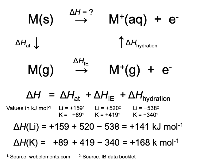 It can be seen that the atomization energy and the ionization energy are both more endothermic for lithium but the hydration energy is considerably more exothermic. It is this relatively high hydration energy that makes the overall enthalpy change less endothermic for lithium than for potassium. The higher hydration energy is due to the smaller size of the lithium ion compared to the potassium ion which increases its charge density.