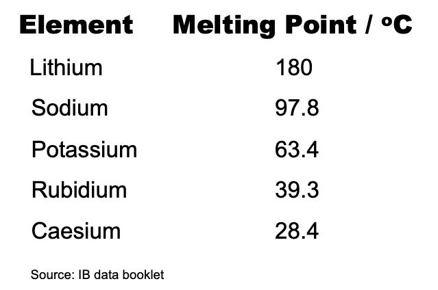 By looking at the reactions of alkali metals with water it seems obvious that potassium is actually more reactive than lithium. When potassium comes into contact with water it reacts quickly and exothermically to produce hydrogen and lilac sparks can be seen as it catches fire. Lithium reacts much more slowly and although hydrogen is steadily produced there are no sparks or flames to be seen. Many sources online state (wrongly!) that the reason why potassium is more reactive than lithium is because the outer electron that is being removed to form the ion is further from the nucleus in potassium than it is in lithium (i.e. in a higher energy level) so less energy is required to remove it. They go on to provide evidence for this by comparing the lower ionization energy of potassium (419 kJ mol-1) with that of lithium (520 kJ mol-1). So why is lithium placed above potassium in the IB’s activity series?