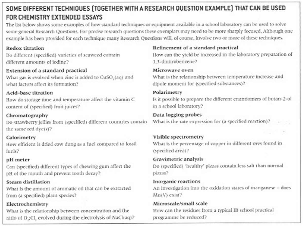 There are several approaches to finding an area to investigate. Some teachers provide a list of topics which you can choose from however there is clear evidence that students who come up with their own topic feel ownership of it and score much more highly on the assessment criteria that measure personal input and initiative (see an article piublished in the Journal of Educational Research by Dr J. Munro). Some students already have a clear idea of the area they want to investigate but many do not. If you do not, then I suggest you look at chemistry journals, newspaper articles or search online until you find something you are interested in. If you can, relate it to the field you want to study at university, e.g. something about drugs if you want to study medicine or veterinary science or something about blood detection if you want to study forensic science etc., as that may help to focus your mind. You could also look at the table below which is taken from my book IB Chemistry 2014 Study Guide on page 179. This table turns the problem on its head. It lists the types of techniques that could be used in a school laboratory and then gives suggestions of possible topics that could be researched for each technique.