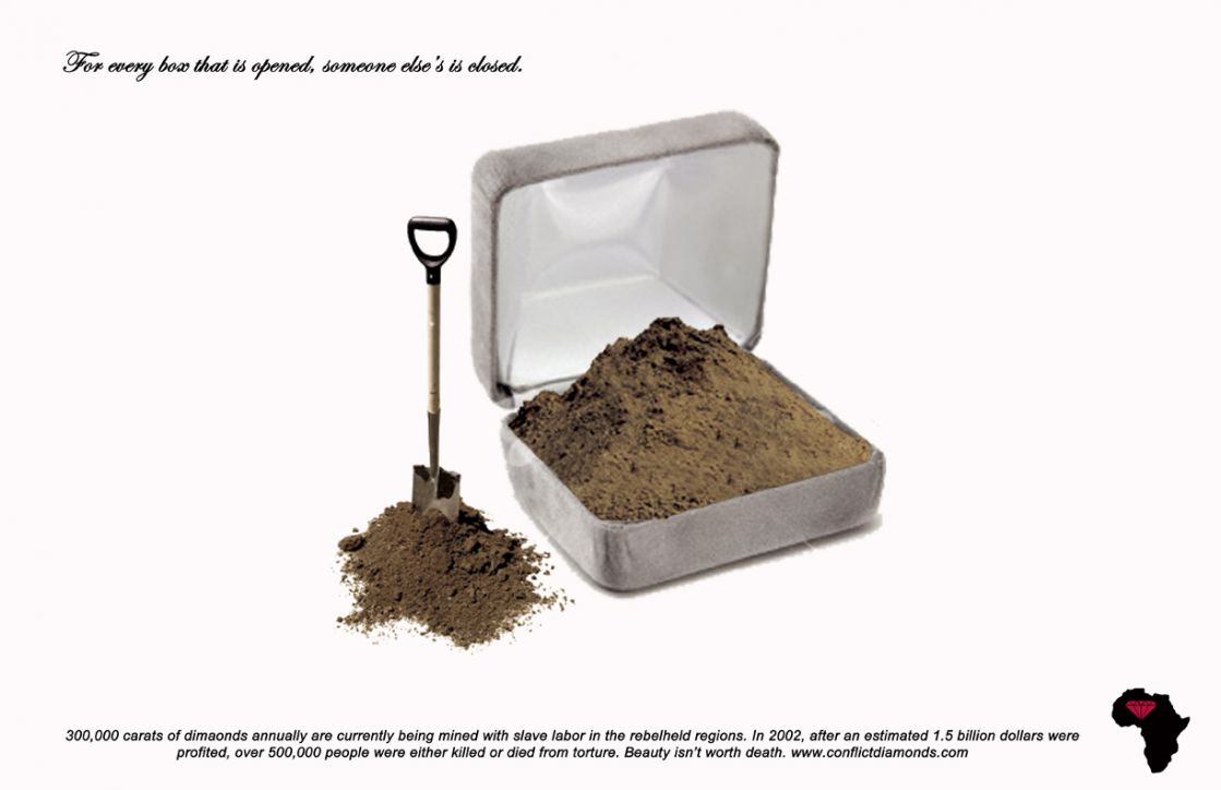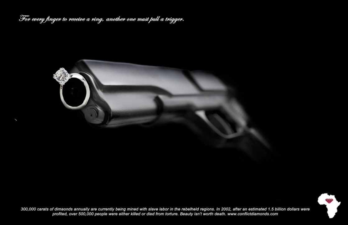 - What do you think of when you think of diamonds? Do you think of violence, death and African wars? Probably not. But these ads will make you stop and think of these injustices next time you see a diamond.
