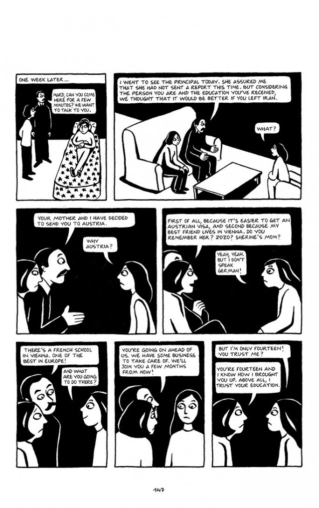 Imagine you have just finished reading the graphic novel Persepolis. Split your class up into groups. Each group must find the most important passage from the section of the work that you have been assigned. Explain to the rest of the class why you think your passage is the most meaningful from your section. Name at least one important theme that is illustrated in your passage. As a class you should be able to come up with a list of five important themes. What makes a theme 'important'?