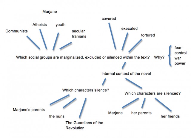 Once you know the themes of a work, you can begin to think about which one of the six prescribed questions is most appropriate. Based on your understanding of Persepolis from the passages above, which one of the six prescribed questions would you think is most appropriate? Once know which prescribed question you want to answer, create a mind map or spider diagram like the one you see below (also based on Persepolis).