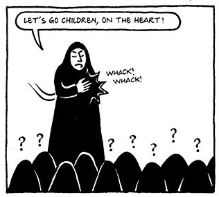 As one reads this graphic novel, one understands how so many people in Iran, not only Marjane and her secular parents, were systematically silenced. When the Islamic Revolutionists overthrew the Shah in 1979, they imprisoned Persian nationalists and the Shah’s military, including the fighter pilots who were needed during the Iraqi attacks (p.83). This is one of several stories that Satrapi tells of people who were hurt, killed or locked up by the extremists in government. These stories are signs of the times in which she lives, which she can easily tell through voiceovers, jumps between comic frames, dialogue bubbles and iconic images. She depicts how even devout Muslims were oppressed by their own beliefs, as one frame shows a man flogging himself and another frame shows an army of veiled women beating their chests and making chants about martyrs (p.96). Through these devices she is able to give the reader a bird’s eye view of the atrocities that everyone suffered and the frenzy in which society found itself. One starts to feel sorry for the children who brag to each other on the school square about how often they pray each day (p.75).