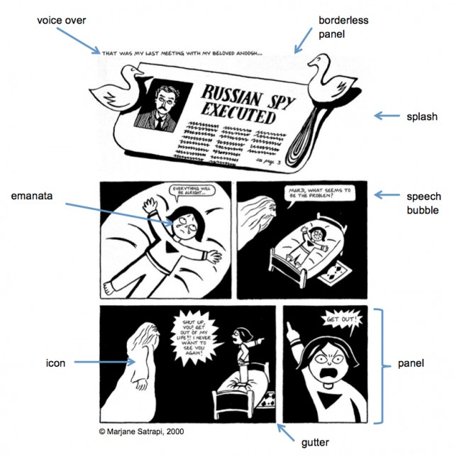 Apply the terminology that you have learned to the following page from Persepolis by Marjane Satrapi. Give a detailed commentary of the stylistic and structural features that she uses. Explain their effects on the target audience? Why has she made these artistic choices? See the sample commentary below after you have discussed this page with others. Did you come up with similar comments?