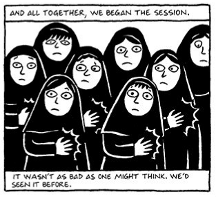 The use of gutters and transitions on this page from Persepolis are characteristic of Satrapi’s graphic novel as they regularly require the reader to make a few mental leaps. Unlike many comic books in the West, Satrapi uses a great amount of non-sequitur transitions. These are transitions in which the one panel does not have any relation to the next panel. We see this in the transition from the fourth to fifth panel, from the fifth to the sixth and from the sixth to the seventh panel. The cognitive abstraction that is made here is from Marjane who is learning to beat herself as a girl in 1980 to Iranian men who beat themselves in general. This is her way of depicting her youth in the greater history of Iran. In the first four frames there are subject to subject transitions, in which we see the girls learning how to beat themselves from four different angles to emphasize the strange nature of this event. You could also argue that there is a motion to motion transition from the teacher beating herself to the students beating themselves, which emphasizes the way in which they were taught through drilling and imitation.