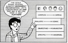 Style - The artist’s drawing style can be discussed using several terms. Scott McCloud, in Understanding Comics, shows that there are four ‘scales’ of style: complex to simple, realistic to iconic, objective to subjective, specific to universal (see image).
