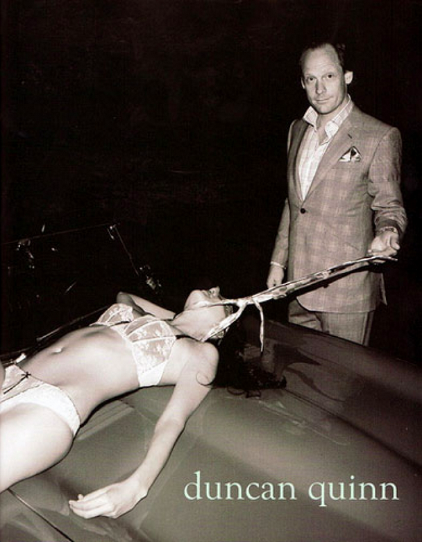 A Duncan Quinn Suit Advertisement, featured in Cosmopolitan's November 2008 issue, propels a perfect example of a helpless. woman under the absolute control of a man, who looks satisfied and confident. The women is positioned lying above an `expensive' car, naked, with a revealing lingerie. The tie around her neck holds a powerful meaning and represents the relationship shared between the man and the