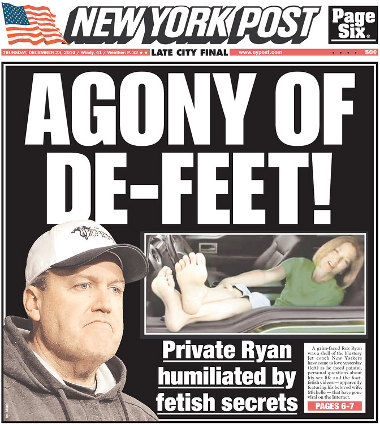 The copy in the lower right-hand corner is about the foot-fetish of NY Jets' coach Rex Ryan. The