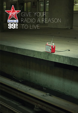 A good example is this Virgin Radio ad with the copy that reads: 'Give your radio a reason to live.' The radio is compared to a suicidal person. It looks sad and lonely on the edge of the platform, ready to jump before the metro or train and kill itself. The target audience is meant to feel sympathy for their radio, like they would feel sympathy for a suicidal person. Logic would tell us that Virgin provides up-beat music to cheer up this radio and yours. This line of logic only works, however, if you believe that radios can be cheered up.