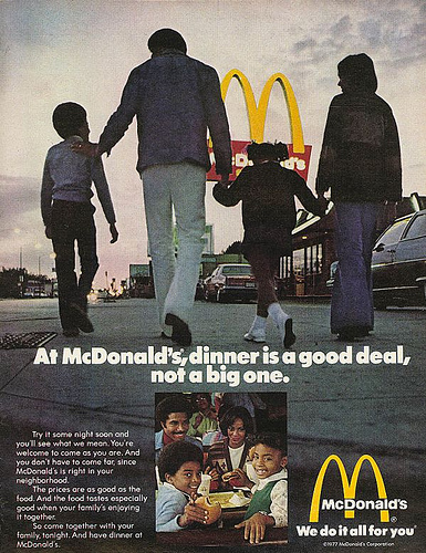 This McDonald's ad is a good example of the bandwagon effect. We see happy people walking by and eating at the restaurant. If we want to be as happy as the people in the ad, then we had better eat at McDonald's.