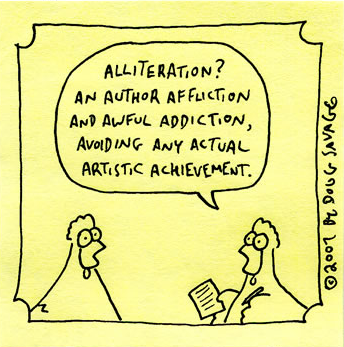 Alliteration is the repetition of sound at the beginning of several words. For example, 'strive, strife and style' all begin with the 'st' sound. This cartoon also shows an example of alliteration where the 'a' sound is repeated in every word. Depending on the sound that is repeated, the use of alliteration can have different effects on an audience. Generally speaking, however, alliteration is used to express the lyrical qualities of language.