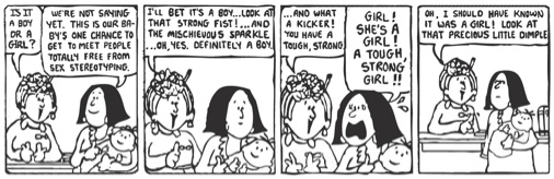 Both the cartoon by Cathy Guisewitte and the memoir by Shusha Guppy, The Blindfold Horse, comment on the importance that people attach to gender once a baby is born. While the texts comment on different cultures and make use of different structures, their message is similar: People look to babies to confirm gender stereotypes.