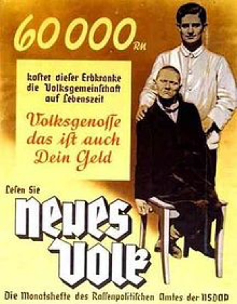 "This person suffering from hereditary defects costs the community 60,000 Reichsmark during his lifetime. Fellow German, that is your money, too."