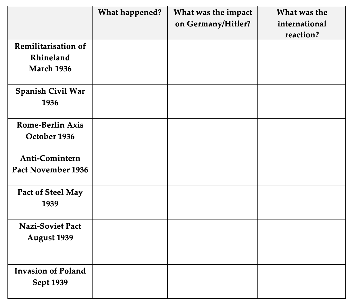 - Discuss in pairs how far each of the events on the grid strengthened Hitler's position with regard to a future war.
