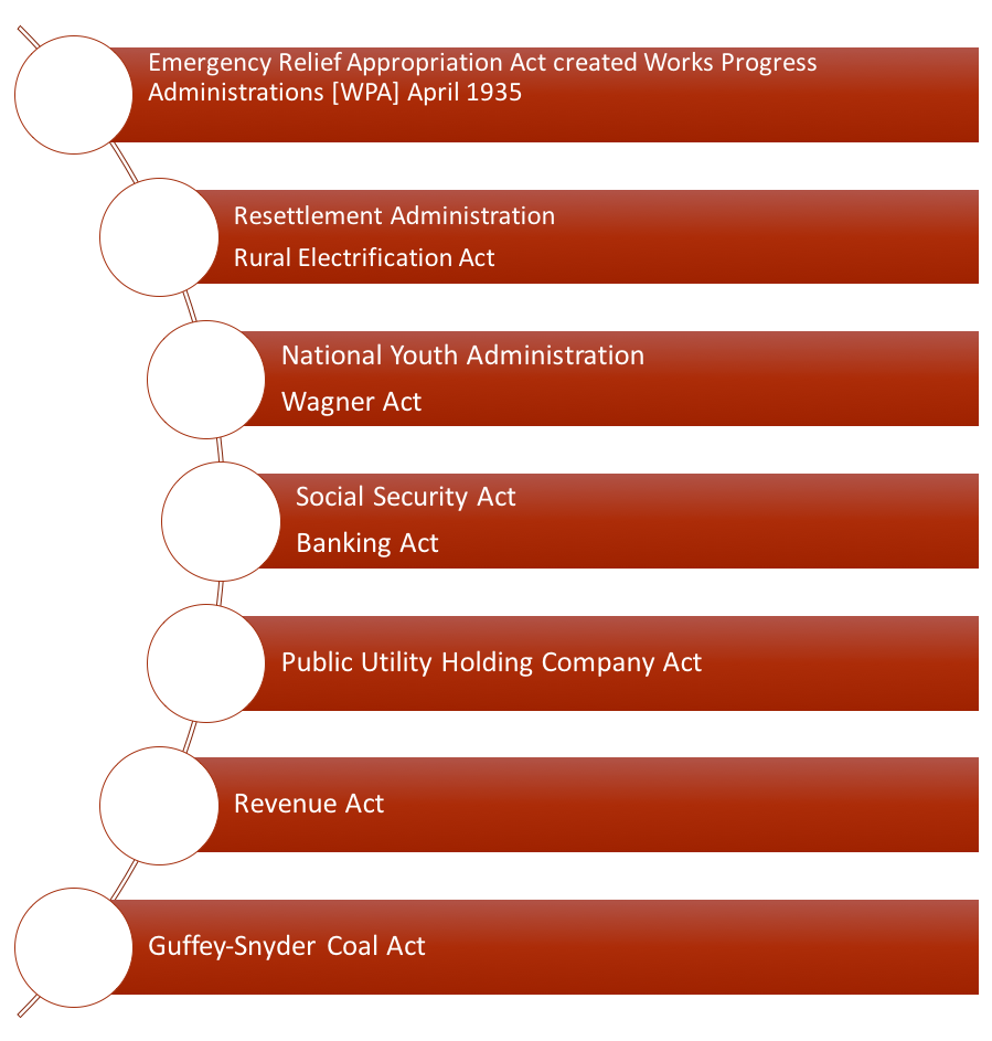 FDR had stated before he became president that the nature of his policies towards the economic crisis would consist of ‘bold experimentation’ and, indeed, experimentation seems to underpin the key acts passed by the Roosevelt administration in the First New Deal. From 1935, FDR then embarked on a Second New Deal which would result in major changes to the social and economic structure of the United States. It would also lay the foundations for a welfare state. As you will have seen, the Supreme Court had challenged the elements of the First New Deal and declared some of its acts unconstitutional. However, after the increase of Democrat control of the Congress and Senate after mid-term elections, and pressure from more radical elements of his party, Roosevelt was able to put forward another series of measures that formed the Second New Deal. FDR had stated before he became president that the nature of his policies towards the economic crisis would ‘bold experimentation’ and experimentation seems to underpin this Second New Deal.