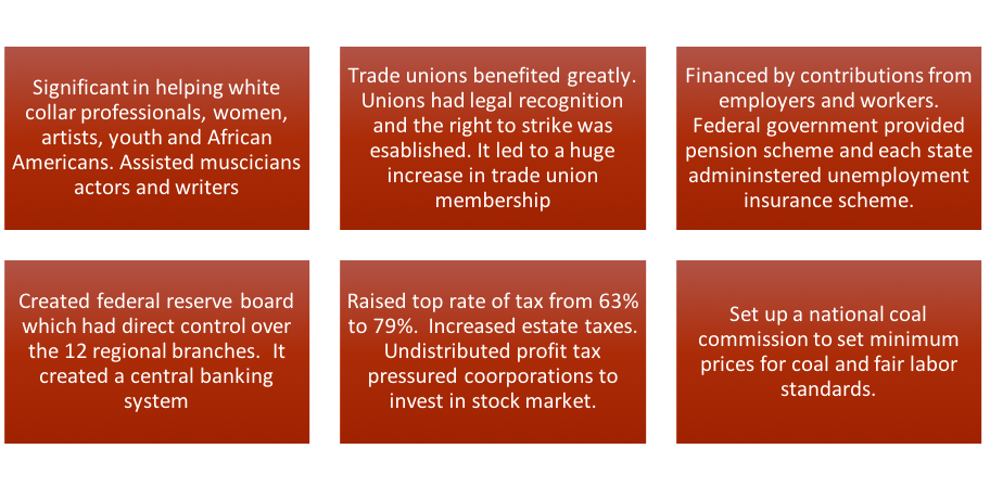 1. In pairs or small groups research the following measures in the chart below which were implemented as part of FDR’s Second New Deal in 1935. Identify who benefited from each measure and again highlight any criticisms that were made against the measure. What other measures were enacted as part of the Second New Deal?
